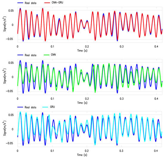 Figure 7b presents the mean absolute error (MAE) between the recovered and actual values for the three types of models on both the training and testing datasets. The proposed CNN-GRU model exhibits a significantly lower MAE than the other two. The MAE values for the CNN-GRU model on the training and testing datasets are low and show no significant disparity. This indicates that the model performs well and has a high generalization ability. The model successfully learns the critical features from the data without over-relying on the training data, allowing it to make accurate predictions on new data. Figure 8 shows a recovery data segment using the above three models.