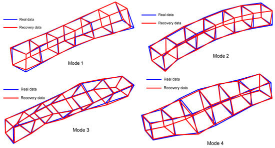 Figure 8 shows that the data recovered by the CNN-GRU are nearly identical to the actual data. In contrast, the data recovered by the individual CNN or GRU models exhibit specific differences. This further demonstrates the robust recovery capability of the proposed method. To further evaluate the data recovered by the CNN-GRU, modal analysis was conducted on the two datasets—the actual data and the data recovered by the CNN-GRU. The results of the mode shapes obtained from the two datasets are presented in Figure 9 and Table 1.
