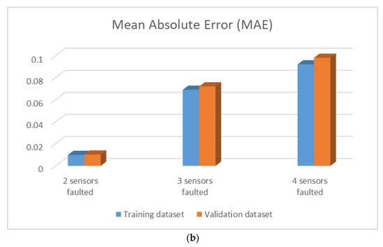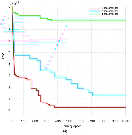 The results in Figure 10a illustrate the convergence process of the model across different data recovery scenarios. In the initial phase, all three scenarios show a significant drop in loss with rapid convergence during the first epochs. The model performs best in recovering data from two sensors as the loss value approaches zero. After around 350 epochs, the convergence curve stabilizes and gradually converges to zero, indicating accurate data recovery. For the scenario involving three faulty sensors, the convergence process is slower, taking over 700 epochs to achieve stability. In the case of recovering data from four sensors, the model initially converges very quickly, but the loss value does not approach zero. This suggests the model may have overfitted and is less effective at handling more complex scenarios where multiple sensors are faulty.