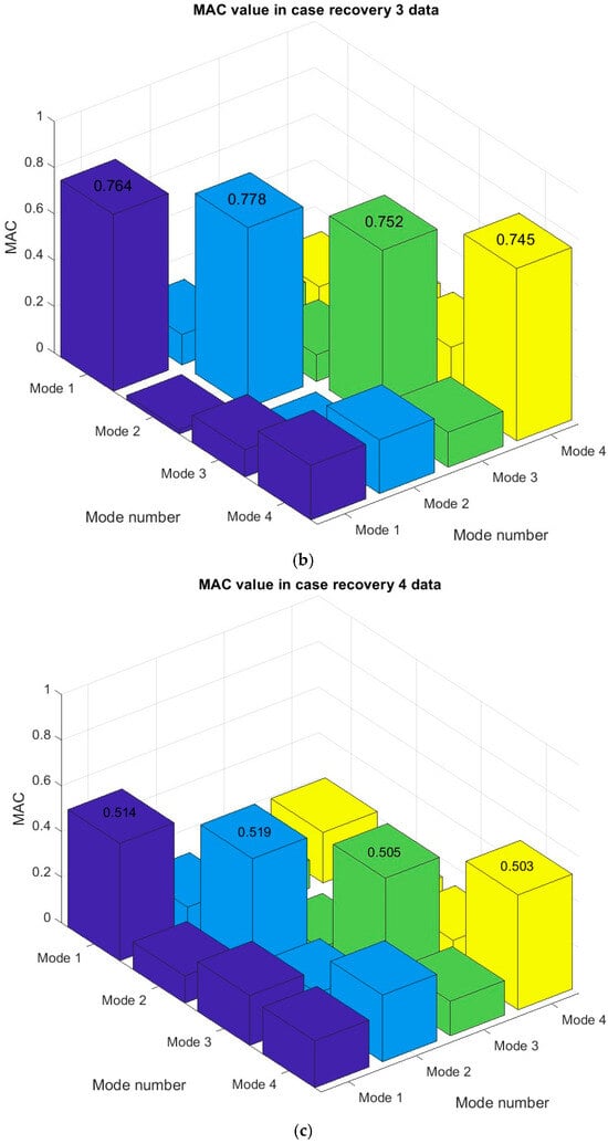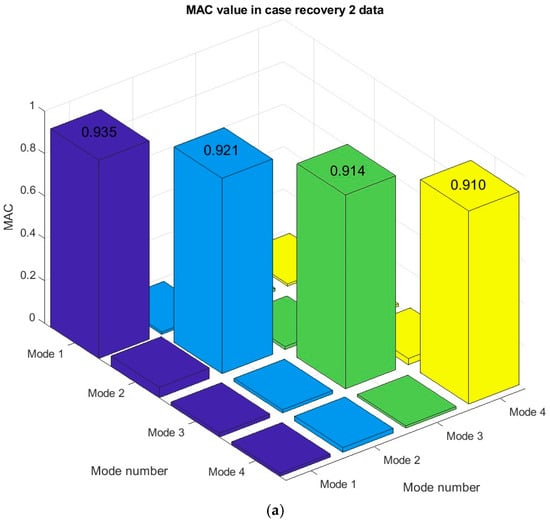 Figure 10b illustrates the MAE values across different scenarios. The initial evaluation indicates that as the number of faulty sensors increases, the MAE value between the recovered data and the actual data also rises accordingly. Specifically, when only two sensors are faulty, the MAE value remains low but experiences a significant increase in the other two scenarios. Notably, the discrepancy between the training and test sets becomes pronounced when three or four sensors are faulty. This suggests that as the number of faulty sensors increases, the effectiveness of the proposed model gradually diminishes. The datasets were also subjected to modal analysis under different data recovery scenarios. After comparing the vibration mode forms of the datasets, the MAC value is displayed in Figure 11.