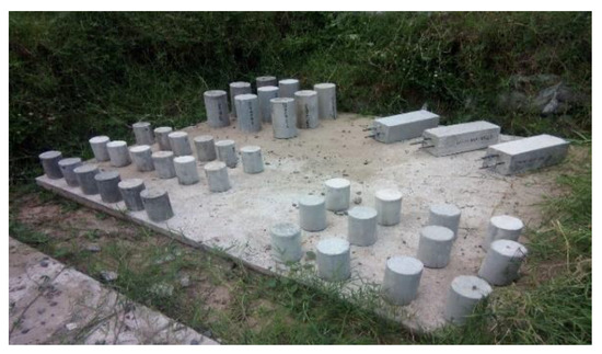 The concrete specimens were placed on the roof of the faculty of Civil Engineering at the Universidad Veracruzana, Boca del Río campus, Mexico, with the following UTM projection coordinates: Zone 14 Q 803,326.31 m east, 2,121,715.45 m north (Figure 3). The specimens were placed at strategic points in the two study areas. Figure 4 shows the placement of the mentioned study specimens. It was decided to place them on a rooftop to ensure as homogeneous exposure as possible, since at ground level, neighboring buildings, vegetation, or other external factors could negatively affect the results of the research. In contrast, placing them on the roof allows the weathering factors to be more representative of real-world conditions. This arrangement ensures that the cylinders are impacted uniformly from all directions, making full use of the specimen area.