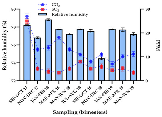 Other variables considered were the levels of SO2 and CO2, gases that contribute to the greenhouse effect and potentiate climate change. According to data from the National Inventory of Greenhouse Gas and Compound Emissions, there are no records available prior to July 2017. Therefore, the work was conducted using data available from that date onwards. It is worth mentioning that, even within the periods with records, there were days in which the levels were 0 or no data were captured. According to Figure 12, the highest levels of both gases were recorded in July, with 25.1 ppm for SO2 and 27.3 ppm for CO2. This suggests that in previous months the levels may have also been elevated. Analyzing specifically CO2, a noticeable change is observed throughout the two and a half years. The highest values were recorded in the bimesters of July–August 2017, January–February, September–October 2018, and May–June 2019, with levels of 27.3, 18.8, 11.11, and 14.5 ppm, respectively.