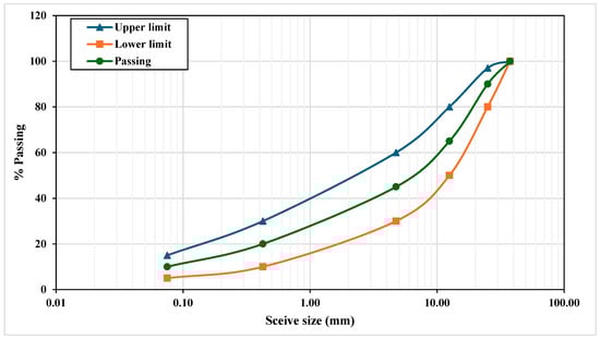 The unbound granular base (UGB) material used in this study was crushed gravel aggregate procured from local quarries supplying an asphalt pavement plant. The gravel was crushed, washed, and screened to meet specifications for base course aggregates as per Iraqi standard R7 []. The grain size distribution of the crushed gravel aggregate is presented in Figure 1. The aggregate was broadly graded between the 3/2 in. and No. 200 sieves, with 10% passing the No. 200 sieve. The coarse fraction retained on the No. 4 sieve was 55% gravel content. The fine fraction passing the No. 4 sieve and retained on the No. 200 sieve was 35%. The fines passing the No. 200 sieve comprised 10% silt/clay-sized particles. This distribution allows for an adequately graded base course material with sufficient fines for particle interlock while preventing excessive amounts that can impact stability.