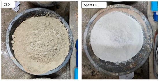 Although there have been several studies examining the use of CBD and FCC individually as substitutes for traditional pavement materials [,,,,,,,,], their combination presents a unique opportunity that has not been explored. This gap is particularly significant because the chemical complementarity of these materials suggests potential synergistic effects—CBD’s high calcium content could effectively activate FCC’s substantial aluminosilicate, potentially leading to enhanced strength development beyond what either material achieves alone. Furthermore, the consumption levels of both waste materials could be optimized—while previous studies focused on using each material separately at higher replacement rates, their combination could achieve better performance with lower total waste material content, making the approach more economically viable. The materials are often generated in geographical proximity, with cement plants and oil refineries frequently located in industrial zones, reducing transportation costs and the environmental impact of the proposed solution. Unlike traditional supplementary cementitious materials like fly ash or slag, both CBD and FCC are currently underutilized in most regions, making their combination a truly novel approach to waste material valorization in pavement applications. This research addresses these opportunities by systematically investigating the combined use of CBD and FCC as a stabilizing agent, with the potential to establish a new pathway for sustainable pavement base construction while simultaneously addressing two significant industrial waste challenges.