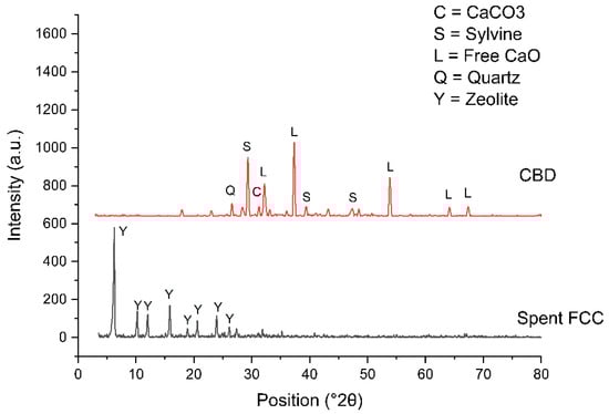 An example of a waste material suitable for use in sustainable pavements is cement bypass dust (CBD), which is collected in the cement production process before the feed enters the main burner []. Typically, CBD consists mainly of limestone and clay minerals that have not undergone calcination []. It may also contain minor amounts of alkali sulfates and free lime []. If the dust is not recycled back into the cement production process, it must be disposed of, leading to environmental concerns. However, the calcium carbonate and alumino-silicate phases in CBD can provide binding properties if used with the proper activation [].