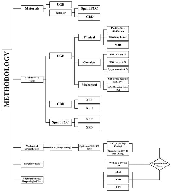 The experimental methodology evaluated a composite binder of cement bypass dust (CBD) and spent fluid catalytic cracking (FCC) catalyst for pavement base stabilization. Three FCC/CBD ratios (30:70, 50:50, 70:30) were investigated to balance CBD’s cementitious properties and FCC’s pozzolanic activity, maximizing their synergistic reactions. Ratios with higher dominance of either material, such as 90:10 or 10:90, were avoided due to potential performance limitations. Excess CBD could lead to reduced pozzolanic activation, while excessive FCC might lack sufficient calcium to support hydration reactions. The chosen ratios represent a practical range that ensures effective chemical interaction based on material feasibility for real-world applications. Unconfined compressive strength tests at 7 days of curing determined the optimal ratio. Four binder percentages of this optimal ratio underwent comprehensive characterization, including mechanical performance, durability, and microstructural analyses. Figure 4 shows the flowchart of the experimental program for determining optimal binder composition and content for enhanced pavement base performance. Table 4 presents the mixing proportions and sample identifications for all combinations.