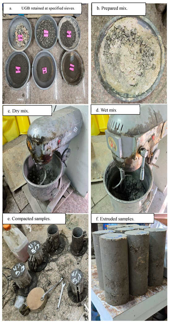 Sample preparation sequence. (a) UGB retained at specified sieves, (b) prepared mix, (c) dry mix, (d) wet mix, (e) compacted samples, and (f) extruded samples.