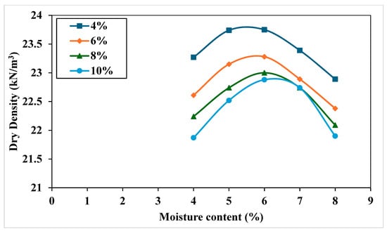 The moisture–density relationship of the stabilized mixes was investigated using the modified Proctor compaction test (ASTM D1557). The tests were conducted on mixes with binder contents of 4%, 6%, 8%, and 10%. As shown in Figure 6, the optimum moisture content increased consistently with higher binder content, from 5.6% at 4% binder to 6.3% at 10% binder. This trend is attributed to the higher water demand of the fine CBD and FCC particles compared to the granular base material. Conversely, the maximum dry density showed a slight decreasing trend from 23.8 kN/m3 to 22.9 kN/m3 as binder content increased from 4% to 10%. This reduction in density can be explained by the lower specific gravity of the binder materials compared to the base aggregate. Table 5 presents the optimum moisture content (OMC) and maximum dry density (MDD) values for each binder content and Figure 6 presents the compaction curves of the stabilized mixes.