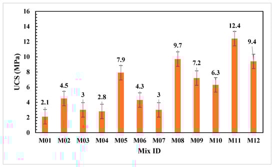 The results demonstrate the significant influence of both binder content and CBD/FCC proportions on strength development. The 50:50 CBD/FCC mixes (M02, M05, M08, M11) exhibit consistently superior UCS values, progressing from 4.5 MPa at 4% binder content to 12.4 MPa at 10% binder content. This marked performance advantage stems from the synergistic interaction between FCC’s pozzolanic reactivity and CBD’s cementitious properties, fostering the formation of a dense, interconnected matrix [,]. The balanced proportions enable optimal chemical interaction between the materials, maximizing their respective contributions to strength development []. The 30:70 CBD/FCC mixes (M01, M04, M07, M10) demonstrate notably lower strength development, with values ranging from 2.1 MPa to 6.3 MPa. This performance limitation reflects insufficient CBD content for proper activation of the FCC’s pozzolanic potential. Particularly telling is the irregular strength progression until reaching 10% binder content, where a significant jump to 6.3 MPa occurs, suggesting that high binder contents are required to compensate for the suboptimal material ratio [].