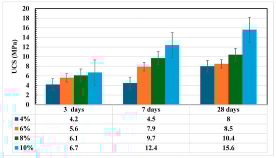 The unconfined compressive strength (UCS) results of the three stabilized granular base mixes at different binder addition percentages and 7 days of curing are presented in Figure 7.