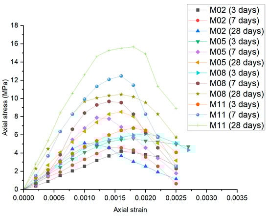 The stress–strain behavior of the stabilized base material containing 50% CBD and 50% FCC was evaluated at 3, 7, and 28 days of curing for binder percentages of 4%, 6%, 8%, and 10%. Figure 9 presents the stress–strain curves for samples cured for 3, 7, and 28 days.