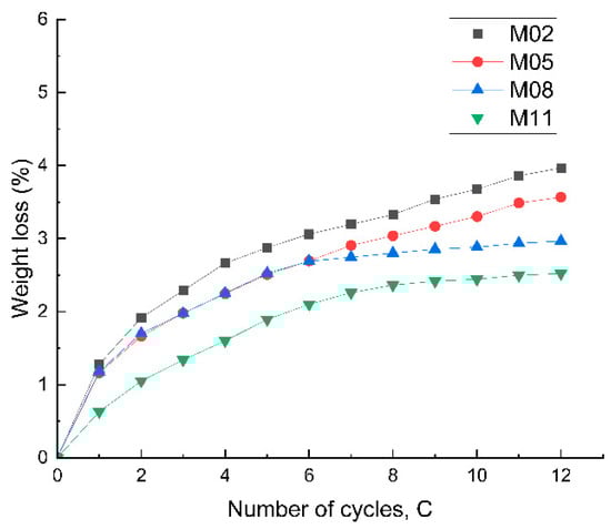 The weight loss during the wetting and drying cycles, calculated as a percentage of the specimen’s original oven-dry mass [], increases with increasing cycles for all binder percentages (Figure 10). The rate of weight loss, however, is notably lower for higher binder percentages (8% and 10%) compared to lower binder percentages (4% and 6%). This observation suggests that increasing the binder content enhances the mixture’s resistance to degradation, likely due to the formation of a more robust and interconnected cementitious matrix. The increase in weight loss with increasing cycles is consistent with the results of [,], which attribute this behavior to the gradual breakdown of the soil–cement bonds and the loss of fine particles during the wetting and drying process.