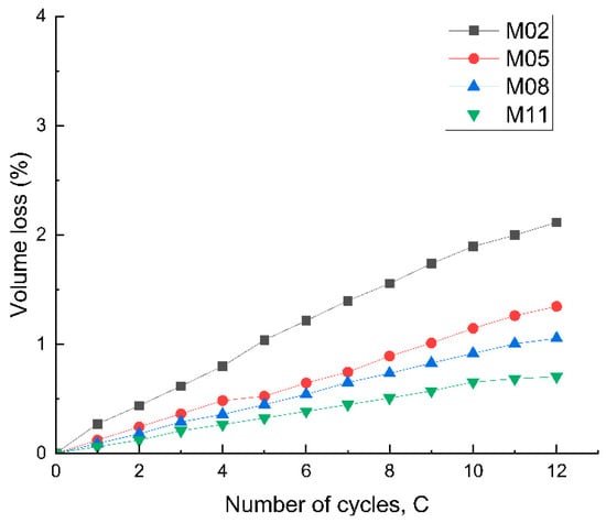 The trend of volume loss also increased as the number of cycles increased, as indicated in (Figure 11), but at a lower rate for higher binder percentages. This outcome shows that increasing the binder content improves the volume stability of the mixture, which is essential for maintaining the structural properties and performance of the pavement’s base layer. The reduced volume loss at a higher binder percentage is due to the presence of some cementitious products, such as calcium silicate hydrate and calcium aluminate hydrate, that enhance the strength and dimensional stability of the mixture []. The hydration products from the reaction between the binder material and the soil particles fill the pores within the soil–cement matrix, making the structure more dense and resistant to moisture-induced volume changes.