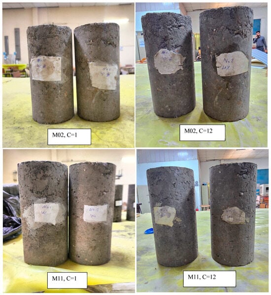 The optimum moisture content for the mixes was determined based on modified Proctor compaction testing per []. The crushed gravel aggregates, cement bypass dust (CBD), and spent fluid catalytic cracking catalyst (FCC) powders were dry-mixed thoroughly in predetermined proportions. A 30 L capacity laboratory mechanical mixer was employed to achieve homogeneity of the blended mixture along with the specified water content. The resulting mixtures were then compacted in 101 mm inner diameter steel cylinder molds having 200 mm height. A modified 4.54 kg Proctor hammer was utilized for compaction by applying 25 blows uniformly distributed in 5 layers. This enabled replication of field densities, with the compacted samples achieving a minimum of 95% modified Proctor density. The prepared stabilized base samples, representing different CBD/FCC ratios and binder contents, were extruded 24 h after compaction and cured in a laboratory environment where ambient room temperature was maintained at 25 ± 2 °C using air conditioning. Specimens were stored on laboratory shelves and covered with plastic sheets to minimize moisture loss during curing. The ambient temperature was monitored daily using laboratory thermometers. For wetting–drying cycles, specimens were subjected to controlled temperature conditions during the drying phase using a thermostatically controlled oven maintained at 71 ± 2 °C for 42 h. The wetting phase was conducted at room temperature (25 ± 2 °C) for 5 h using tap water. All strength tests were performed at room temperature after specimens were removed from their storage location. The laboratory conditions were selected to represent typical ambient curing environments that would be encountered in field applications. The sample preparation sequence is presented in Figure 5.
