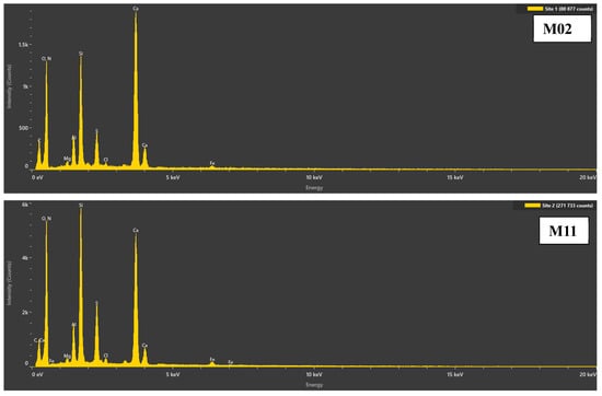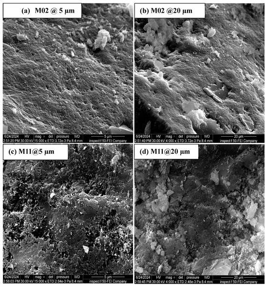 Stress–strain analysis of the stabilized base material containing 50% CBD and 50% FCC was evaluated at different curing periods. The secant modulus at 50% of the ultimate stress (E50) was determined from stress–strain curves to characterize material stiffness. As shown in Table 6, E50 values demonstrated consistent increases with both curing time and binder content, progressing from 2547 MPa for M02 at 3 days to 13,922 MPa for M11 at 28 days. This substantial improvement in stiffness, particularly pronounced in M11, indicates progressive formation of cementitious products through hydration and pozzolanic reactions []. The synergistic effect of CBD and FCC contributes to both short-term and long-term stiffness development. The CBD component provides early stiffness through hydration reactions, while the FCC enhances long-term performance through pozzolanic reactions, similar to findings reported by [] in their study of FCC as a supplementary cementitious material. The observed trends in E50 evolution demonstrate the effectiveness of the CBD-FCC blend in improving the mechanical properties of the stabilized base material, with results comparable to those reported for other cement-based and pozzolanic stabilized materials []. The E50 results are summarized in Table 6.