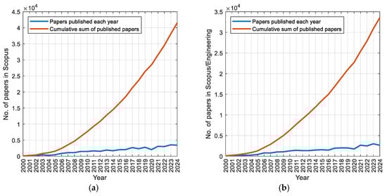 Scopus articles in “structural health monitoring” (query made on 15 November 2024): (a) all fields, (b) “Engineering” field only.