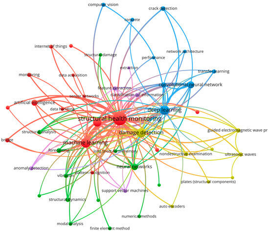 The most prominent nodes are “structural health monitoring”, “learning algorithms” (red node on the left of SHM; the text is hidden in the figure), “machine learning”, “deep learning”, and “damage detection”. These central terms are heavily interconnected, indicating that these topics form the core of the current research focus on AI-based SHM. The strong links between “machine learning” and “damage detection” highlight the extensive use of ML algorithms in identifying structural damage patterns. Similarly, the connection between “deep learning” and “convolutional neural network” reflects the popularity of convolutional neural networks (CNNs) for processing visual data in crack detection and other tasks.