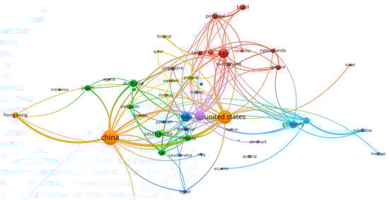 Based on the same Scopus dataset as Figure 3, Figure 4 focuses on the co-authorship network among the top countries contributing to the field of SHM and AI. Setting a minimum of 5 publications per country, a connected network of 54 countries was identified, with the top 50 displayed on the map. The minimum connection strength was set to 4. In this visualization, the links (lines) between countries indicate the frequency of co-authorship, while the size of each node (bubble) represents the publication volume of each country in SHM+AI research.
