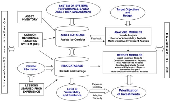 A system-of-systems performance-based asset risk management approach integrates various elements to support investment prioritization for infrastructure resilience. At the core of this approach are the Asset Database, which contains asset characteristics by corridor, and the Risk Database, which registers hazards and damages. These databases are supported by an Asset Inventory and a Common Reference Location System (GIS), forming the foundation for the analysis modules. Inputs of Climate Information and Lessons Learned from Experience contribute to assessing vulnerability and resilience, accounting for exposure, sensitivity, and adaptive capacity of roadway assets.