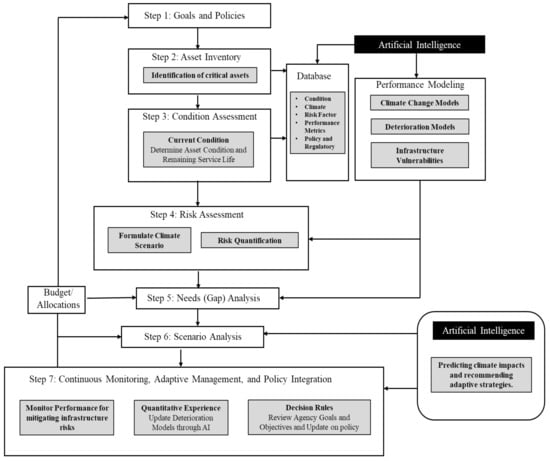 In the final step, continuous monitoring and adaptive management ensure that risk assessment remains an ongoing component of the asset management process. Collected data can be analyzed using AI tools to update deterioration models, refine risk projections, and recommend adaptive strategies based on real-time data. This adaptive approach allows for immediate adjustments as new information emerges, ensuring that risk management evolves with changing conditions. For example, as updated risk data become available, agencies can modify their strategies to enhance resilience, aligning them with the latest insights and organizational goals.