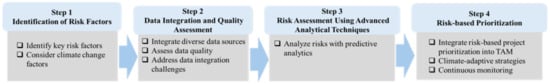 The prioritization process begins with the identification of risk factors in Step 1, emphasizing the need to determine key risks, including those related to climate change. In Step 2, data integration and quality assessment are carried out by merging diverse data sources, evaluating data quality, and addressing challenges related to data consistency. The process advances to Step 3, where predictive analytics are employed to analyze risks, providing insights into potential impacts. The final step, Step 4, involves risk-based prioritization of investments and the implementation of climate-adaptive approaches in asset management practices.