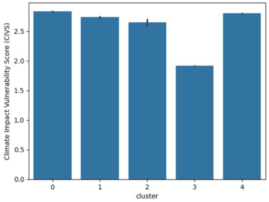 The Climate Impact Vulnerability Score (CIVS) was calculated using the Analytical Hierarchy Process (AHP). After assigning equal weights to these factors, a pairwise comparison matrix was created to evaluate their significance in relation to each other. The matrix was used to generate a priority vector through the eigenvector method, which provided the weights for each criterion. These weights were then applied to the values of each factor within the clusters, and the weighted sum of these factors for each cluster resulted in the final Climate Impact Vulnerability Score, as shown in Figure 6.