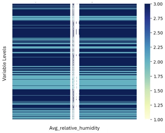 In Figure 7, the heatmap illustrates a wide range of relative humidity values across bridges within Cluster 0. Dark blue shades indicate bridges experiencing higher levels of humidity, while lighter blue shades indicate lower humidity (in Table 1, avg. relative humidity has the following levels: 0–50% = 1, 50–75% = 2, more than 75% = 3). This variation indicates that some bridges in the cluster are more exposed to moisture (Level 3, meaning a relative humidity of more than 75%, indicated in dark blue) potentially leading to a higher risk of deterioration due to humidity-related factors, such as corrosion or material degradation.