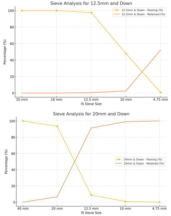 - Aggregates: This study utilized two varieties of coarse aggregates: 12.5 mm and down and 20 mm and down. The aggregates were chosen in compliance with IS 383-2016 [18], guaranteeing that they fulfilled structural concrete’s chemical and physical requirements [18]. The sieve analysis for both aggregates confirmed their compliance with the standard grading limits, with the larger aggregate showing a cumulative percent passing of 93.5% at the 20 mm sieve and the smaller aggregate showing 97.5% passing at the 12.5 mm sieve.