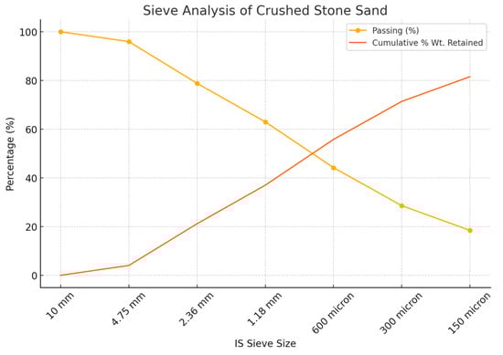 - Crushed Stone Sand: The crushed stone sand used as a fine aggregate was sourced from a crusher plant, meeting the quality standards of IS 383-2016. Despite the potential for a higher content of fine particles (up to 150 microns), the sand utilized in this study was within the permissible limits, confirming Zone II requirements as per the standard, as shown in Figure 2.