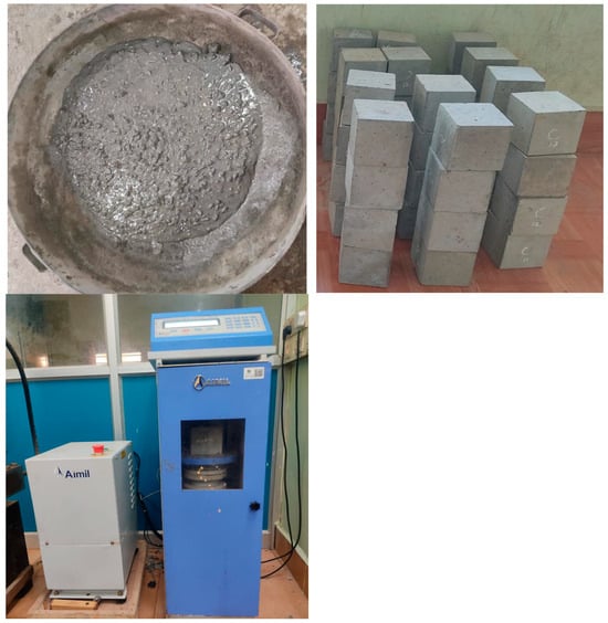 Figure 3 illustrates the preparation, casting, and compressive strength testing of concrete specimens used in this study.