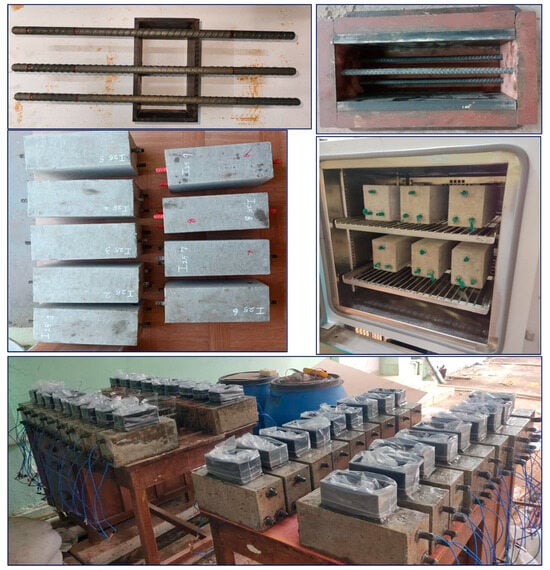 Additionally, the corrosion potential of the embedded steel was evaluated against a reference electrode following ASTM C876-22b standards [25]. This setup enabled a detailed assessment of the ICRETE additive’s ability to reduce corrosion by monitoring variations in current and potential over time, offering insights into its potential to enhance concrete durability for sustainable construction applications. Figure 4 shows an overview of the Macrocell Corrosion Testing Process, including steel rebar arrangement, mold preparation, hardened specimen, controlled humidity conditions, and the chloride exposure and corrosion monitoring setup.