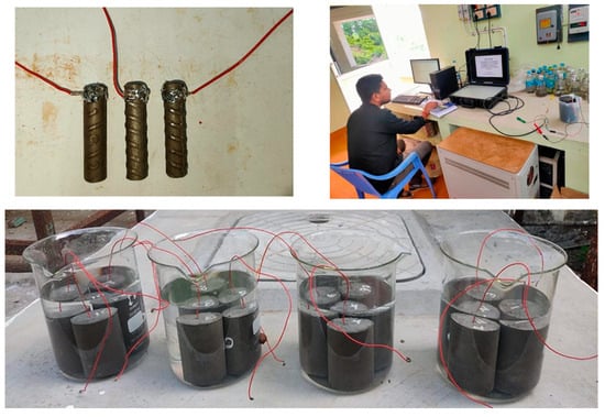Figure 5 shows the electrochemical testing setup for corrosion evaluation, including steel rebar preparation with lead wires, immersion of concrete specimens in 3% NaCl solution for electrochemical analysis, and the monitoring setup during electrochemical impedance spectroscopy and LPR measurements.