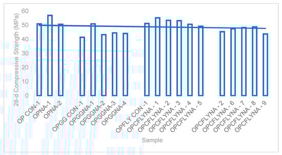The 28-day compressive strength results for various concrete mixes, listed in Table 5, are presented in Figure 6. The control mix (OP CON-1) achieved a compressive strength of 50.9 MPa, serving as a baseline for comparison. In the OPC Mix Series, including the innovative additive at dosages of 0.8% and 1.2%, resulted in enhanced compressive strengths, with OPNA-1 reaching the highest value of 56.93 MPa. At the same time, OPNA-2 showed a slight reduction to 50.61 MPa. The OPC+GGBS Mix Series exhibited a moderate decrease in compressive strength, ranging from 41.41 MPa (OPGG CON-1) to 44.52 MPa (OPGGNA-3). The OPC+PFA Mix Series showed varied results, peaking at 55.17 MPa for OPCFLYNA-1, with a general trend of declining strength as the additive dosage increased, culminating in a compressive strength of 43.73 MPa for OPCFLYNA-9. Overall, Figure 6 shows that although the novel additive can increase compressive strength in some mixes, its efficacy depends on the particular cementitious combination and dose; performance noticeably declines at higher dosages, especially in PFA blends.