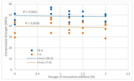Relationship Between Dosage of Innovative Additive and Compressive Strength at 7-Day and 28-Day Intervals.