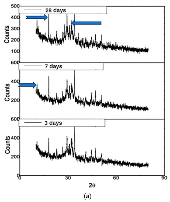 The OPC+GGBS Mix Series specimen (OPGG CON-1), as shown in Figure 9a, displays prominent peaks associated with calcium hydroxide (CH) and calcium silicate hydrate (C-S-H) phases at different hydration stages (3, 7, and 28 days). The intensity of the CH peaks at 28 days suggests a typical hydration process with some remaining free lime content, which may affect durability. The CH peaks gradually decrease with time, implying that GGBS is causing a continual pozzolanic reaction that encourages the creation of more C-S-H phases and produces a more refined microstructure.