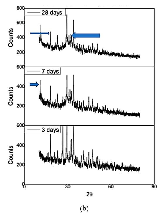 In contrast, the OPC+GGBS Mix Series specimen with 2% innovative additive (OPGGNA-4), depicted in Figure 9b, demonstrates a more pronounced reduction in CH peaks over the same time intervals (3, 7, and 28 days). The notable decline in CH seen on day 28 implies that the novel addition has quickened the pozzolanic reaction, which has increased CH consumption and furthered the production of advantageous C-S-H phases. As a result, the microstructure is denser and more resilient than the reference specimen’s. Additionally, the overall intensity of the peaks indicates the formation of fewer crystalline phases, highlighting the role of the additive in promoting a more amorphous and stable hydration product.