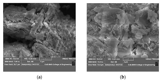 SEM of the specimen (a) OPC+GGBS Mix Series specimen (OPGG CON-1), (b) OPC+GGBS Mix Series specimen with 2% innovative additive (OPGGNA-4).