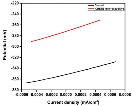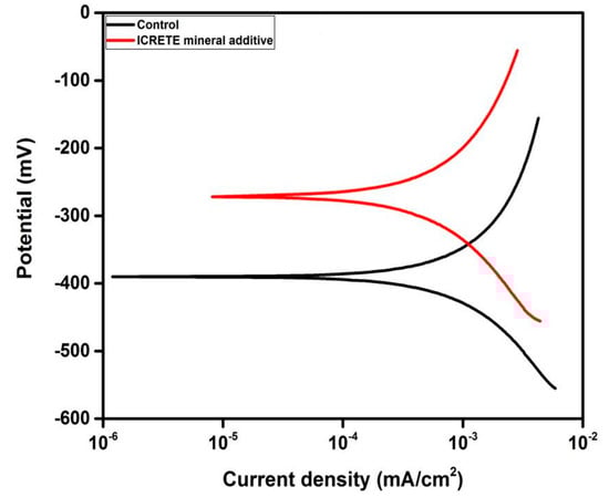 Potentiodynamic polarization curve for steel rebar embedded in concrete with and without (control) ICRETE mineral additive.