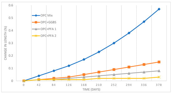 Expansion behavior of various concrete mixes immersed in a 5% Na2SO4 solution over 378 days.