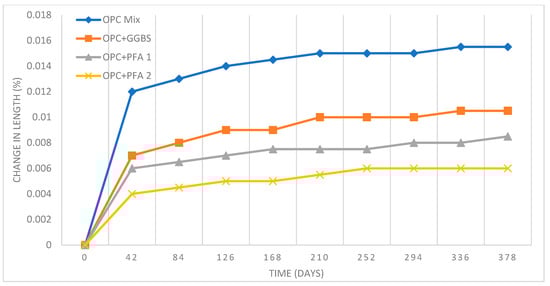 Figure 14 presents the expansion behavior of concrete samples immersed in a 5% Na2SO4 solution over 378 days. The OPC Mix Series, serving as the control, exhibits the most significant expansion, reaching approximately 0.57% after 12 months, indicating significant vulnerability to sulfate attacks. In contrast, the OPC+GGBS Mix Series shows a substantial reduction in expansion, with a maximum expansion of around 0.31%. The OPC+PFA Mix Series 1 and OPC+PFA Mix Series 2 demonstrate further improvements in sulfate resistance, with expansions of 0.14% and 0.08%, respectively. These lower expansion values suggest that using PFA, especially in higher dosages, considerably enhances the sulfate resistance of concrete, outperforming the control mix significantly.