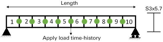 This research employed a FEM to simulate the dynamic behavior of a simply supported beam subjected to various damage scenarios. A FEM of an S3×5.7 steel section was generated using the OpenSeesPy library [69] platform. The model utilized the section’s specific properties, including an area of 1077.42 mm2 and a moment of inertia of 1.05 × 106 mm4. The modulus of elasticity was set at 200 × 103 N/mm2, and the steel material’s density was specified as 7670 kg/m3. As illustrated in Figure 4, the beam was discretized into ten individual elements to facilitate the application of time-history loading. Each element was modeled using the ‘elasticBeamColumn’ element type, with masses lumped at the nodes. A linear dynamic time-history analysis was performed using Newmark integration, where gamma and beta coefficients were set to 0.50 and 0.25, respectively. A comprehensive set of 1000 random Gaussian-based load time-history profiles with a mean of 0 and standard deviation varying between 300 N and 700 N was applied vertically at the beam’s mid-span. The Gaussian nature of these load profiles is characterized by their stochastic properties, where the loads are generated with a normal distribution of values. In addition to the inherent variability of the Gaussian distribution, 15% noise was added to simulate further the unpredictability often encountered in real-world loading conditions. This approach simulates the variability and randomness encountered in real-world loading conditions, providing a more realistic representation of operational environments and uncertainties. This approach ensures a robust simulation environment, capturing the dynamic response of the beam under varying loading conditions and providing a realistic dataset for SHM analysis.
