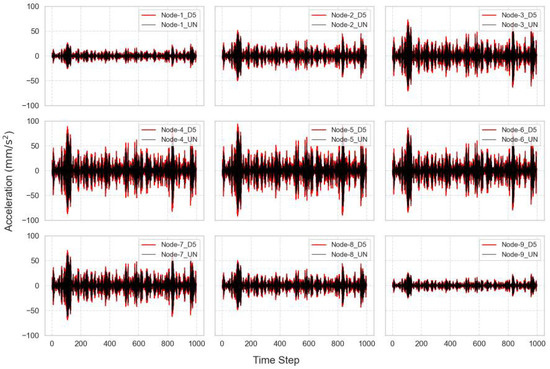Each excitation consisted of a time history with 1000 data points at a time step of 5 milliseconds (5 × 10−3 s), resulting in a total analysis duration of 5 s per loading scenario. This choice of time discretization ensures sufficient resolution to capture the essential features of the beam’s dynamic response. Acceleration outputs were recorded at every interior node of interest (Node-1 to Node-9 from left to right), marked by green solid circles in Figure 4. Each recorded data sample comprised of 1000 rows and 9 columns, representing the beam’s complete response at each node throughout the 5-s excitation. An illustrative acceleration output from the healthy state (UN) and damaged state (D5) condition for Bridge-A is presented in Figure 5. As seen in the figure, the acceleration response for the damaged structure (D5), represented by the red line, becomes more pronounced when approaching the damage location at mid-span. In contrast, the undamaged structure (UN) shows relatively lower acceleration values, represented by the thinner black line. Despite the subtle global differences, the local increases in acceleration due to damage are significant enough for the CNN-based software to effectively identify and classify the damage, particularly in the more severe cases. These local variations, captured by the CNN, enhance the detection capability even when the overall response may appear similar between cases. Moreover, it is noteworthy that this study did not focus on sensor optimization, and rather, focus was on proof of concept of TL. However, in a separate work by the leading authors, the effect of sensor subset selection was explored using a 2D CNN on an experimental dataset [41].