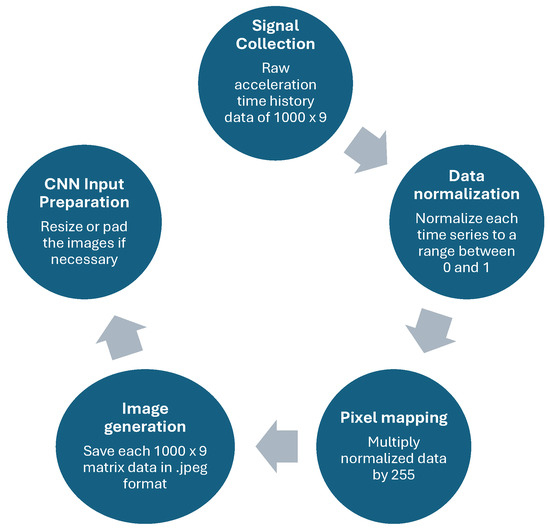 One of the key novelties of this study lies in the strategic conversion of 1D acceleration time-series into 2D grayscale images (Figure 6). This seemingly simple transformation unlocks the immense potential of CNNs in SHM-based SDD tasks. Traditionally, CNNs have dominated image processing tasks, excelling at extracting intricate spatial patterns and hierarchical relationships from visual data. While not their native domain, this study demonstrates the power of transforming non-image data such as time-series signals into a format capitalizing on CNNs’ strengths. The conversion process involves meticulously crafting a 2D representation where each pixel intensity, ranging from 0 to 255, encodes a specific value from the original signal data. This approach leverages the inherent power of CNNs in recognizing spatial relationships from images. By transforming the 1D signal into a 2D “feature landscape”, the CNNs can exploit their superior feature extraction and classification capabilities, often limited when using raw 1D data or conventional signal processing techniques [70].