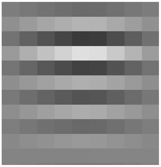 The converted 2D grayscale images are a powerful visual representation of the underlying acceleration data. These images (Figure 7), sized at 1000 × 9 pixels—where the 1000 rows correspond to the time steps and each of the 9 columns represents data from an interior node during the time-history analysis—were saved in .jpeg format to optimize computational efficiency during training and ensure compatibility with standard CNN architectures. In healthy or undamaged states, the acceleration measurements exhibit a consistent pattern with relatively low magnitudes. This consistency translates into grayscale images with a dominance of mid-range gray values. Darker pixels (closer to black) represent the lowest normalized acceleration values, while lighter pixels (closer to white) depict higher acceleration values. However, the specific relationship between gray values and acceleration magnitudes depends on the chosen normalization scheme (e.g., min-max scaling).