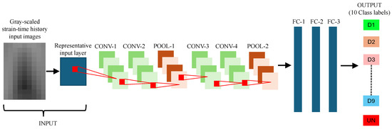 Following the implementation of the grid search algorithm for a key set of parameters and their variables presented in Table 2, the optimal architecture and model summary were chosen and presented as illustrated in Figure 8 and Table 3. The chosen CNN architecture consisted of two convolutional layers (CONV), each followed by a batch normalization layer (BATCHNORM) and a pooling layer (POOL). After this, another set of two convolutional layers was added, again with each layer followed by batch normalization and pooling. Finally, the network was completed with three fully connected (FC) layers and a dense SoftMax output layer. As shown in Table 2 and Figure 8, in the final architecture, the number of filters (or kernels) are arranged in ascending order [16, 32, 64, 128], where each layer uses the Rectified Linear Unit (ReLU) activation function (Equation (2)) to introduce non-linearity into the network [72]. ReLU takes input from the previous layer (z in Equation (2)) and applies a simple thresholding operation. It returns the input value if it is positive and 0 otherwise.