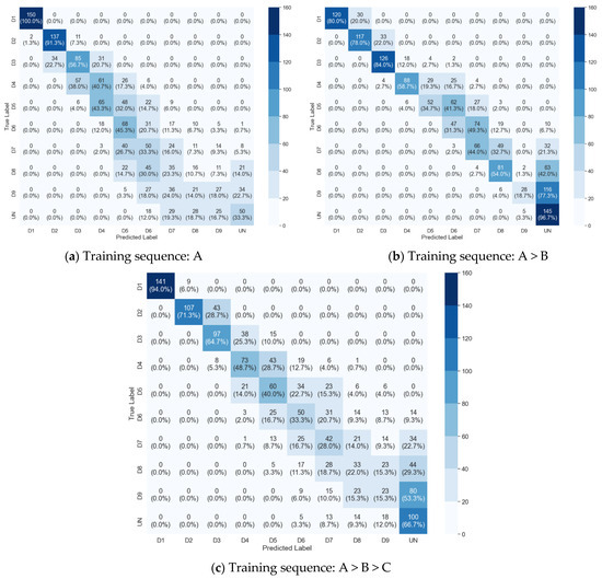 The JT model’s 0.91 accuracy on Bridge-D illustrates its strong generalization capabilities, surpassing the 0.48 accuracy of the A > B > C sequence. This result is particularly noteworthy given that Bridge-D’s characteristics lie between Bridge-A and Bridge-C. The JT model successfully captures this middle ground, effectively bridging the gap between different domains. Moreover, the confusion matrix for JT reveals a balanced performance across all damage levels, from severe (D1) to slight (D9), which contrasts with the higher misclassification rates observed in the sequential training methods. This indicates that the JT model has a more nuanced understanding of the damage spectrum, allowing it to distinguish even the subtle differences between classes.