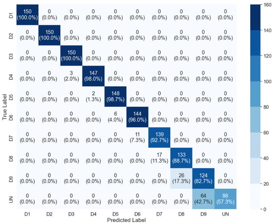 For the severe damage case (D1), all metrics are perfect (1.0), which indicates that the model identifies severe damage with complete accuracy and no false positives or negatives. This level of precision is a marked improvement over the A, A > B, and A > B > C sequences, where misclassifications in severe damage were more frequent. This is crucial for real-world applications where early detection of severe damage is critical for public safety. The precision score slightly drops from D1 to D9—especially for D9—highlighting the difficulty in distinguishing between minimal damage and healthy states. This trend aligns with the physical reality of SHM, where minor damages are inherently more challenging to detect. For D9 (slightest damage), the substantial drop in precision and recall unveils significant overlap with each other in low-damage and undamaged classes. The model has more difficulty in differentiating negligible damage, possibly due to the subtlety of features. Therefore, this could be attributed to feature similarity or noise in the data. Recall decreases progressively from severe to negligible damage while the macro average confirms the model’s robustness across all classes. For the healthy case (UN), the recall score of 0.57 means that some of the healthy instances are misclassified as damaged. This could be due to the model’s sensitivity to minor variations misinterpreted by the network as damage.
