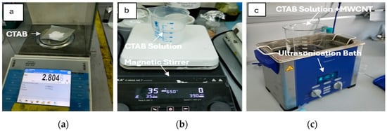 Figure 1. (a) Weighing CTAB; (b) solving CTAB in water by magnetic stirring; (c) ultrasonication.
