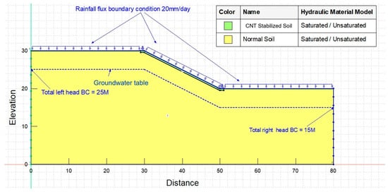 Various computer software applications have been developed, and this has enabled smooth performance of complex calculations and effective replications by the simple use of inputs and data. Compared to observations conducted in the field, there are fewer chances for errors, and more detailed analysis is possible through various computer software. In this research, Slope/W was used for analyzing stability of slope. Slope/W is usually used in geotechnical engineering to analyze the safety of slopes and embankments []. The software allows the users to input the soil properties and slope geometry and the boundary condition. It calculates the factor of safety of slope and indicates whether the slope is stable or not []. SEEP/W is a numerical software that can be used to manage and analyze the seepage of water in homogenous and non-homogenous soil []. SEEP/W is a computer-aided design (CAD) software that uses finite-element analysis for analyzing groundwater flow and seepage. Moreover, it has the capability to address a wide range of problems, from saturated steady-state concerns to unsaturated and time-dependent analysis problems.