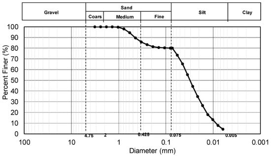 The results of the laboratory testing on the soil with and without MWCNTs are summarized in Table 1. According to ASTM D2487–17e1, the investigated soil was classified based on Unified Soil Classification System (USCS). The result from USCS shows that the soil classification did not change when the soil was added with MWCNTs since MWCNTs are considered to be nanoparticles. The result from index properties shows that adding carbon nanotubes into soil increased liquid limit and plastic limit and decreased the plasticity index of the soil. The grain-size distribution from the investigated soil is presented in Figure 3.